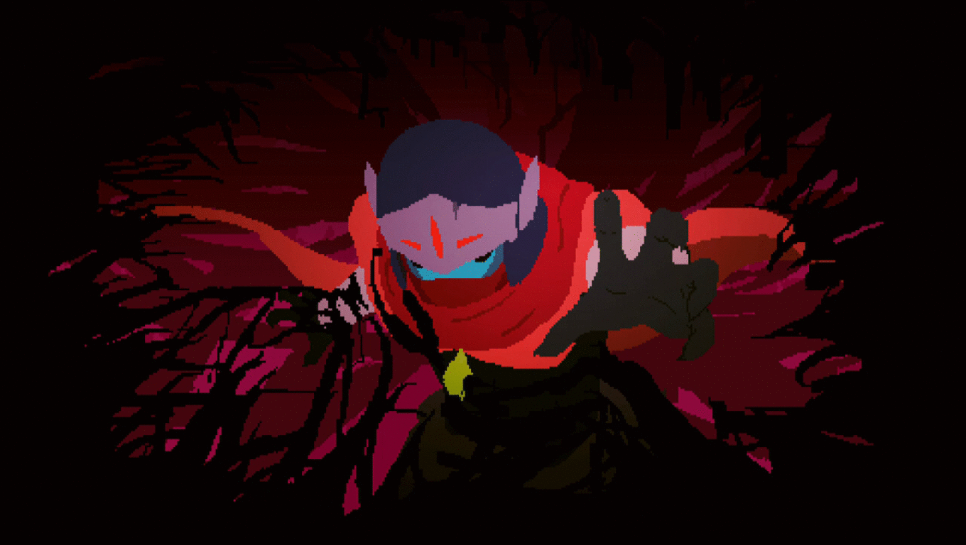 The screen is bled to white from the emanation and immediately in the aftermath, both the titans/giant figures and the dead humanoid races in the river appear. In the midst of all this carnage, The Drifter (player character) appears in his iconic uniform, standing in the river turned red with blood. The bodies disappear and he doubles over, coughing up blood. In The Drifter's sickness, he is attacked by a spreading black goo monster (who we know from the Steam trading cards to be named after the tarot card, 'Judgement'). Judgement is a formless black-coloured entity that grows from the blood The Drifter coughed-up. It also has a single, pink-coloured diamond in the centre of it's 'head' indicating its 'face'.