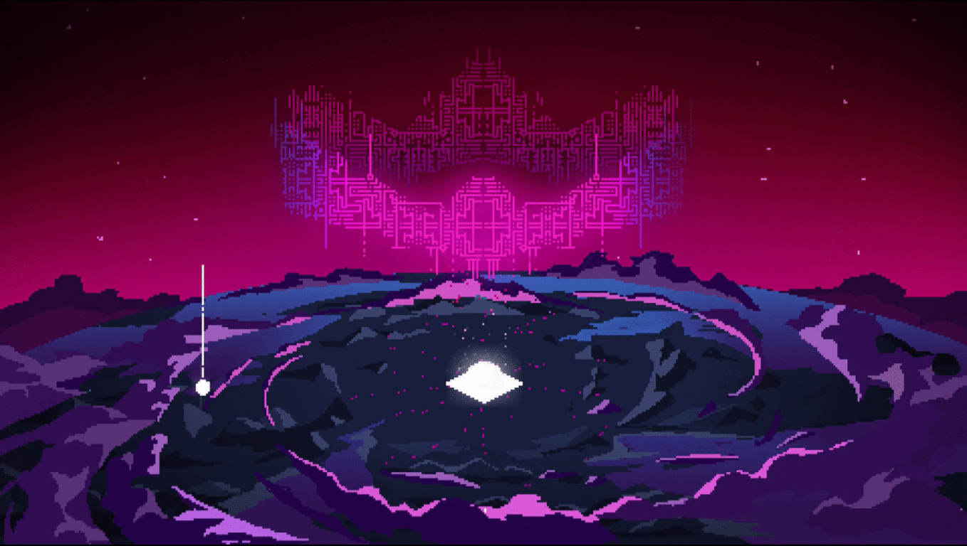 Back to that introduction: the world as it is presented to us is not the same as the world we explore throughout Hyper Light Drifter. This world is shown as a four-leaf clover style affair with a central city and four green prongs of land surrounding it. Those prongs have signs of life on them, but nothing to rival the city. However, I don't think this is meant to be a literal image of the world of Hyper Light Drifter... for instance, we do not ever see such a light show as is seen here: